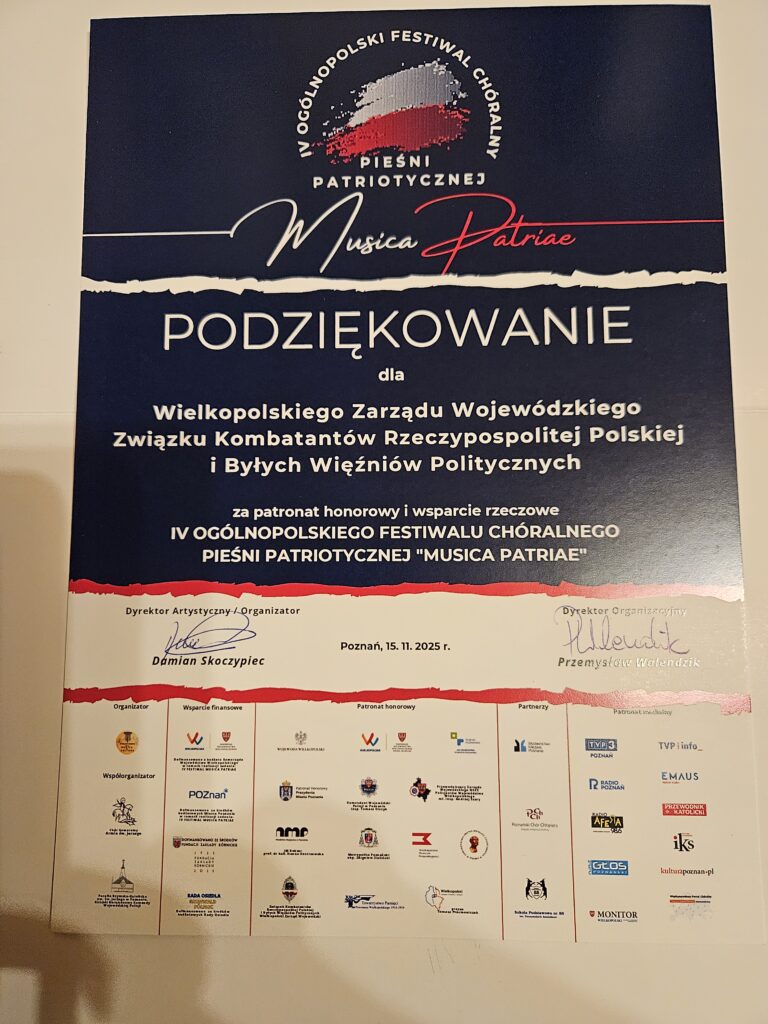 Patronat Honorowy nad IV Ogólnopolskim Festiwalem Chóralnym Pieśni Patriotycznej MUSICA PATRIAE Poznań 2025 objęli m. in.: